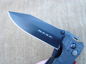 The MPSK has three separate locking blades. The main blade is 3.6”” in length and is made of black Teflon coated N690Co stainless steel, tempered to 58/60 HRC. It features a partially serrated semi-clip point design with a stud on the edge of the spine for easy one handed opening. A liner lock retains the blade in the open position, and for additional security a secondary lock in the form of a red cross-hatched lever can be manually pushed forward preventing the liner lock from being released accidentally.