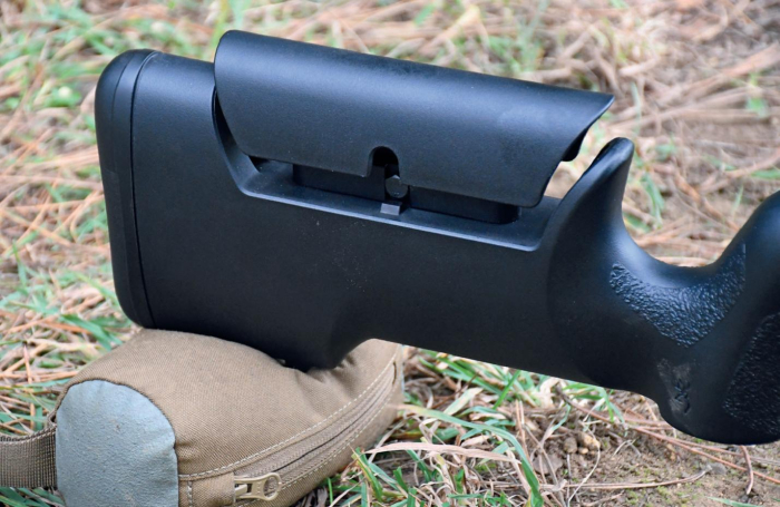 The 23mm diameter knurled adjuster for the comb can be swapped left or right and didn’t seem to need much more than a ‘nip’ to remain positioned and rigid within its underlying aluminium hardware. Bolt removal is possible with the cheek piece in most positions and it’s good to see graduated markings to allow accurate re-positioning if you do take it out.