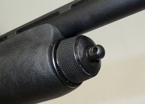 Both the stock and forend are black plastic with stylised panels of chequered stippling around the grip and along either side, the butt rounded off with a thick rubber recoil pad, the forend held in place by a full sized mag cap that tightens into place by use of a simple ratchet. The flush-fit multi-choke barrel, in this instance supplied with just ½ actually measures 25½” although the book says it 26” but the missing fraction would seem to make little if no particular difference to the gun’s overall performance.