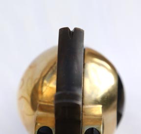 The pistol is a good copy of the S&G revolver with a brass frame, trigger guard and backstrap; the barrel, cylinder, wedge and all of the screws are black with case colours on the loading lever, hammer and trigger. The black has a nice gloss and the edges are particularly sharp with just a little over polishing on a couple of corners. The case colours on the loading lever are very well executed. The metal-to-metal fit is very good but the wood grips are slightly over-sized, a common fault on all of the Italian offerings, showing that they were not polished on the pistol.