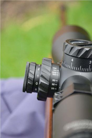Side parallax adjustment on the left-hand knob is a minimum of 10-yards, then 15, 25, 35, 50, 100, 200, and infinity, so clarity can be set at the desired range. The parallax dial was a little stiff on my test model, but this would probably ease with use. Illumination of the cross hair is also possible by turning the outer left knob, which acts as the rheostat. Illumination comes in either green or red, and both get five steps of brightness in each, and back to a central off position. Clarity and brightness are good, and there’s definitely a robust feel to the mechanics.
